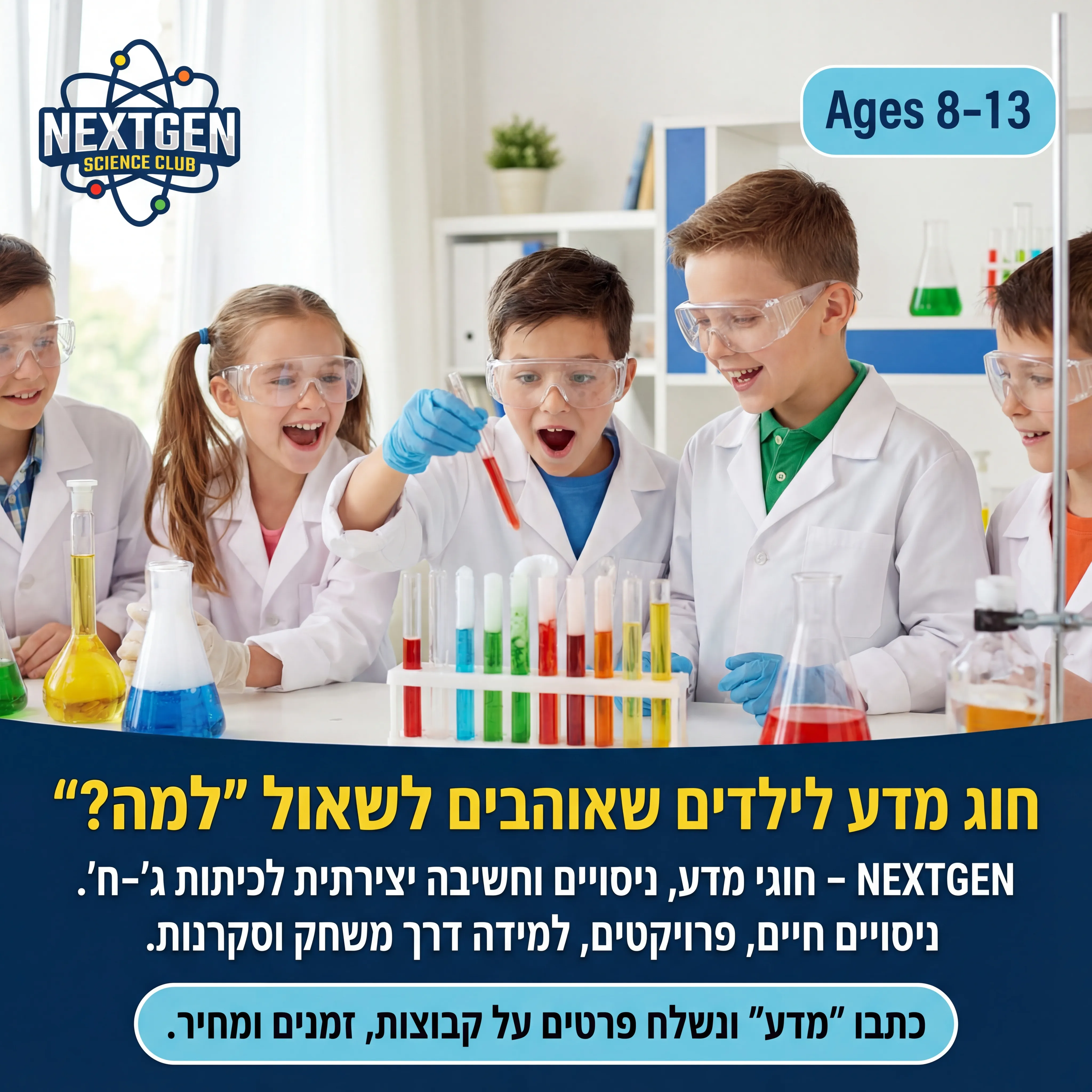 "🧪 NEXTGEN SCIENCE CLUB 3 טקסט מודעה: כותרת: חוג מדע לילדים שאוהבים לשאול "למה?". שורה שנייה: NEXTGEN – חוגי מדע, ניסויים וחשיבה יצירתית לכיתות ג'–ח'. שורה שלישית: ניסויים חיים, פרויקטים, למידה דרך משחק וסקרנות. CTA: כתבו "מדע" ונשלח פרטים על קבוצות, זמנים ומחיר. רעיון לתמונה: ילדים עם חלוק/משקפי מגן עושים ניסוי במבחנות צבעוניות, פרצוף מתלהב. לוגו NEXTGEN SCIENCE CLUB בפינה."