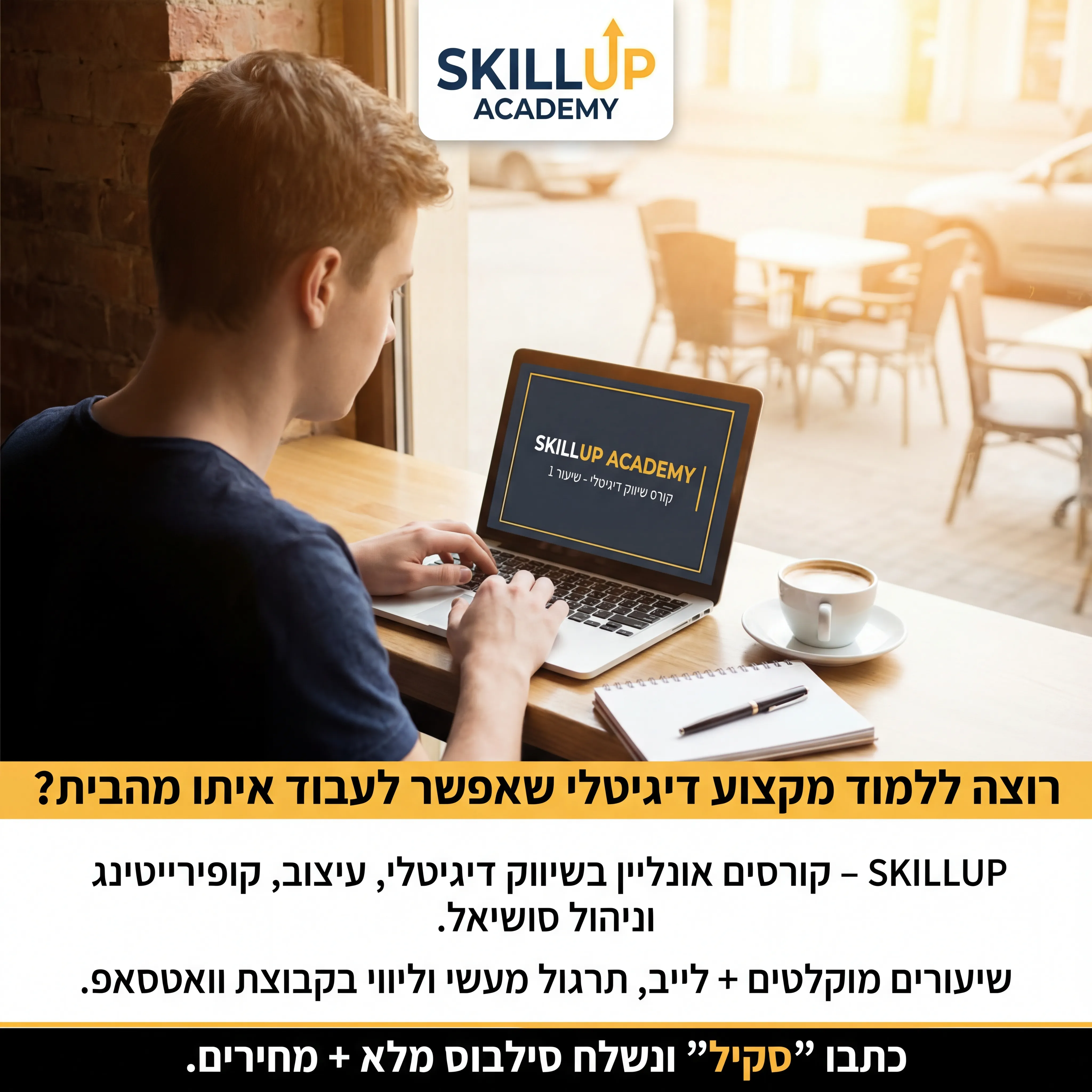 "🎓 SKILLUP ACADEMY 1 טקסט מודעה: כותרת: רוצה ללמוד מקצוע דיגיטלי שאפשר לעבוד איתו מהבית? שורה שנייה: SKILLUP – קורסים אונליין בשיווק דיגיטלי, עיצוב, קופירייטינג וניהול סושיאל. שורה שלישית: שיעורים מוקלטים + לייב, תרגול מעשי וליווי בקבוצת וואטסאפ. CTA: כתבו "סקיל" ונשלח סילבוס מלא + מחירים. רעיון לתמונה: צעיר/ה עם לפטופ, כוס קפה, מחברת, יושב/ת בבית או בבית קפה. על המסך שקופית קורס. לוגו SKILLUP ACADEMY בפינה."