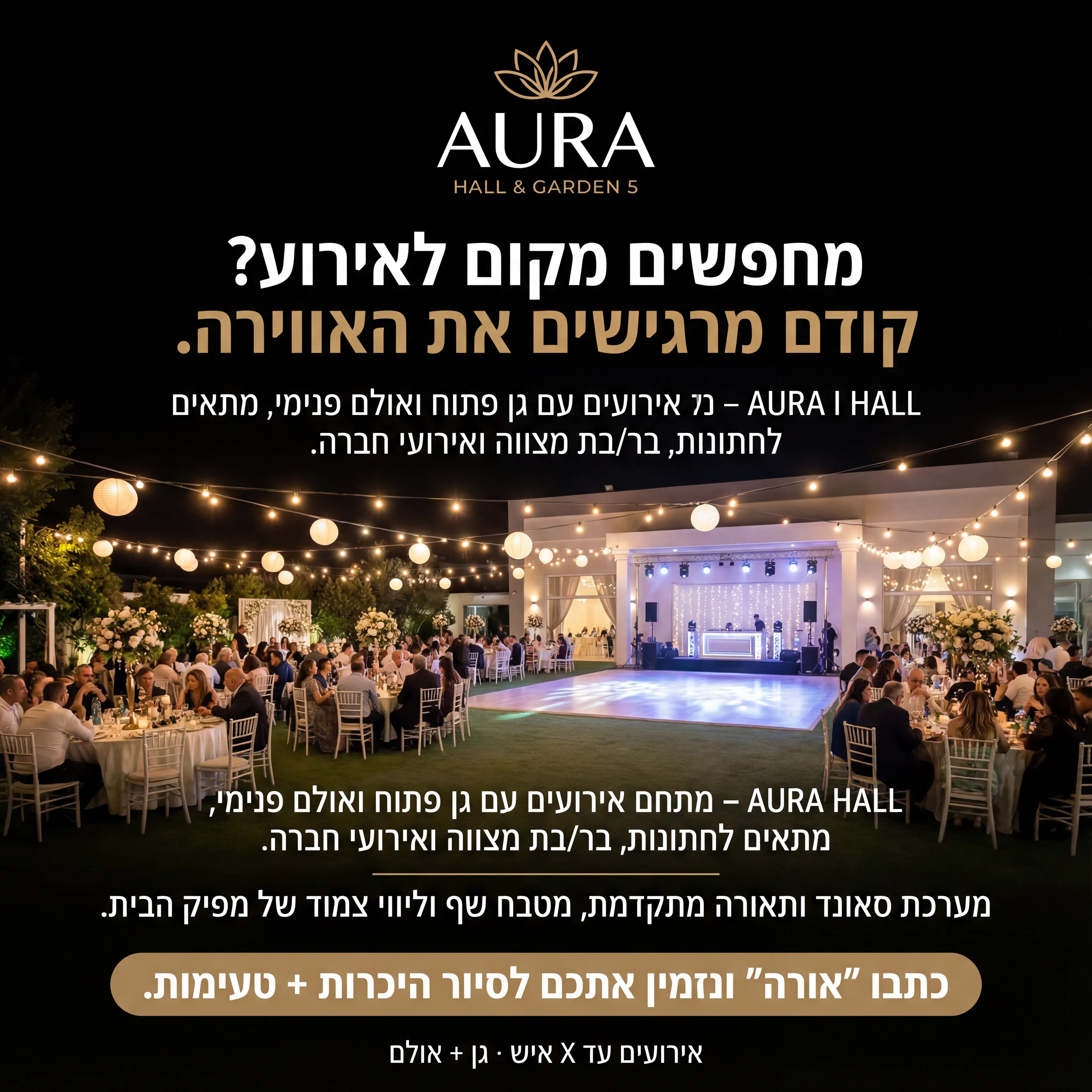 "🏛️ AURA HALL & GARDEN 5 טקסט מודעה: כותרת: מחפשים מקום לאירוע? קודם מרגישים את האווירה. שורה שנייה: AURA HALL – מתחם אירועים עם גן פתוח ואולם פנימי, מתאים לחתונות, בר/בת מצווה ואירועי חברה. שורה שלישית: מערכת סאונד ותאורה מתקדמת, מטבח שף וליווי צמוד של מפיק הבית. CTA: כתבו "אורה" ונזמין אתכם לסיור היכרות + טעימות. רעיון לתמונה: צילום ערב של גן אירועים מואר בפנסים, אנשים יושבים בשולחנות, רחבה ברקע. לוגו AURA HALL & GARDEN למעלה. טקסט קטן: "אירועים עד X איש · גן + אולם"."
