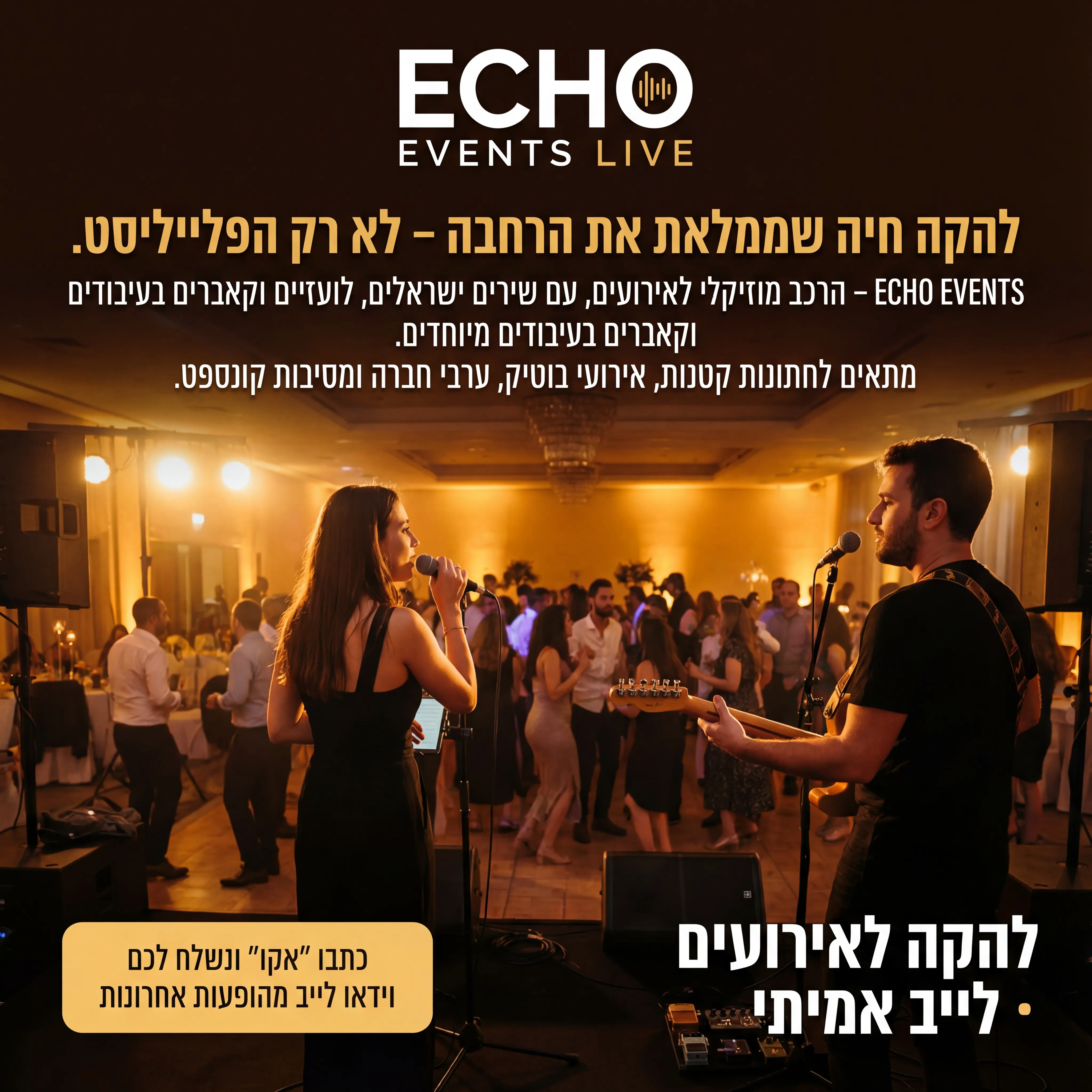 "🎤 ECHO EVENTS LIVE 3 טקסט מודעה: כותרת: להקה חיה שממלאת את הרחבה – לא רק הפלייליסט. שורה שנייה: ECHO EVENTS – הרכב מוזיקלי לאירועים, עם שירים ישראליים, לועזיים וקאברים בעיבודים מיוחדים. שורה שלישית: מתאים לחתונות קטנות, אירועי בוטיק, ערבי חברה ומסיבות קונספט. CTA: כתבו "אקו" ונשלח לכם וידאו לייב מהופעות אחרונות. רעיון לתמונה: במה קטנה באירוע, זמר/ת עם מיקרופון, גיטרה, אור חם, קהל רוקד ברקע. לוגו ECHO EVENTS LIVE למעלה. טקסט קטן: "להקה לאירועים · לייב אמיתי"."