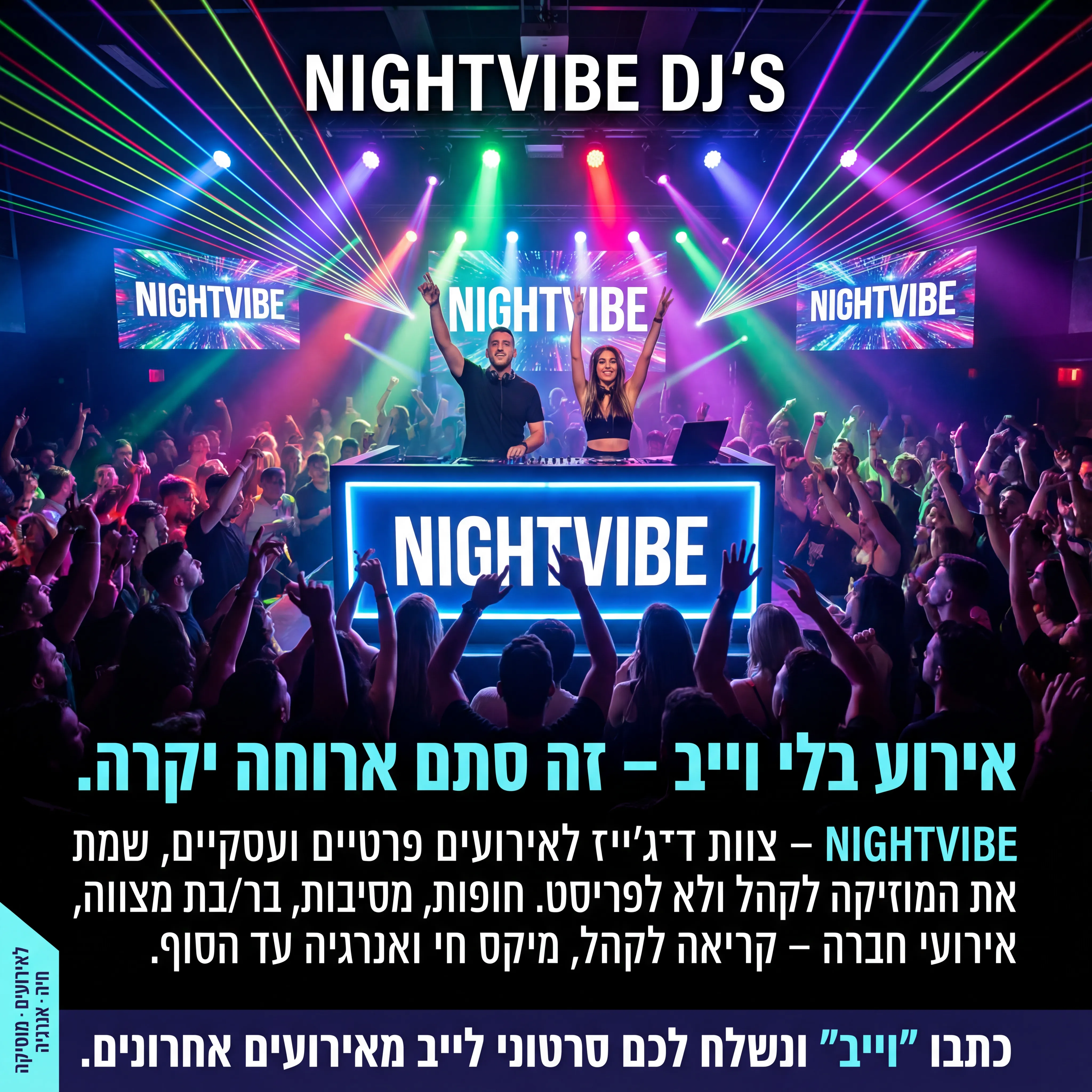 "🎧 NIGHTVIBE DJ'S 1 טקסט מודעה: כותרת: אירוע בלי וייב – זה סתם ארוחה יקרה. שורה שנייה: NIGHTVIBE – צוות די־ג'ייז לאירועים פרטיים ועסקיים, שמתאימים את המוזיקה לקהל ולא לפריסט. שורה שלישית: חופות, מסיבות, בר/בת מצווה, אירועי חברה – קריאה לקהל, מיקס חי ואנרגיה עד הסוף. CTA: כתבו "וייב" ונשלח לכם סרטוני לייב מאירועים אחרונים. רעיון לתמונה: רחבת ריקודים מלאה, אורות צבעוניים, די־ג'יי בעמדה עם יד באוויר. על העמדה לוגו NIGHTVIBE. טקסט קטן בצד: "די־ג'ייז לאירועים · מוסיקה חיה · אנרגיה"."