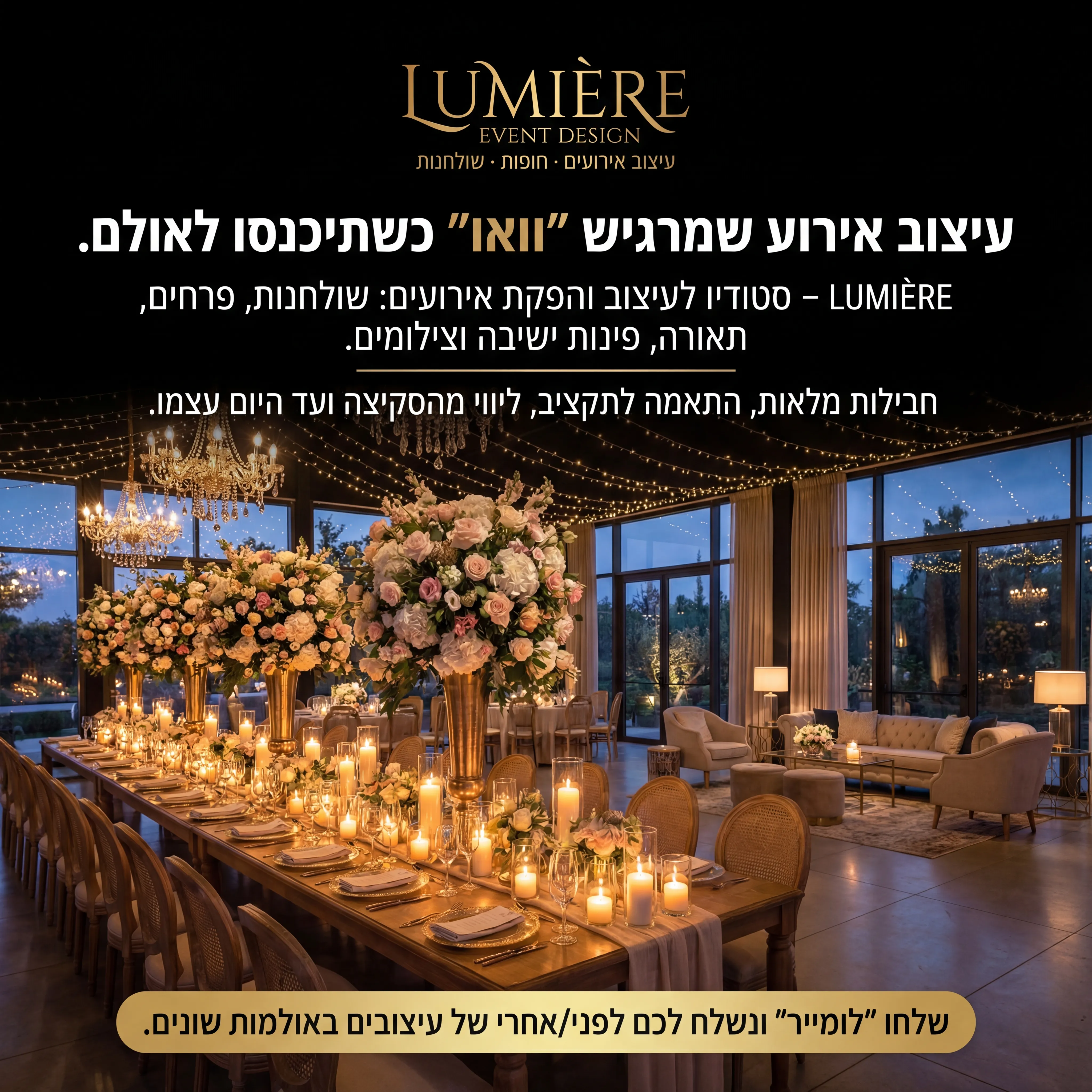 "🕯️ LUMIÈRE EVENT DESIGN 4 טקסט מודעה: כותרת: עיצוב אירוע שמרגיש "וואו" כשתיכנסו לאולם. שורה שנייה: LUMIÈRE – סטודיו לעיצוב והפקת אירועים: שולחנות, פרחים, תאורה, פינות ישיבה וצילומים. שורה שלישית: חבילות מלאות, התאמה לתקציב, ליווי מהסקיצה ועד היום עצמו. CTA: שלחו "לומייר" ונשלח לכם לפני/אחרי של עיצובים באולמות שונים. רעיון לתמונה: אולם/גן אירועים מעוצב: שולחן ארוך עם מרכזי פרחים, נרות, תאורה חמה, פינת ישיבה מעוצבת. לוגו LUMIÈRE EVENT DESIGN באמצע למעלה. טקסט קטן: "עיצוב אירועים · חופות · שולחנות"."