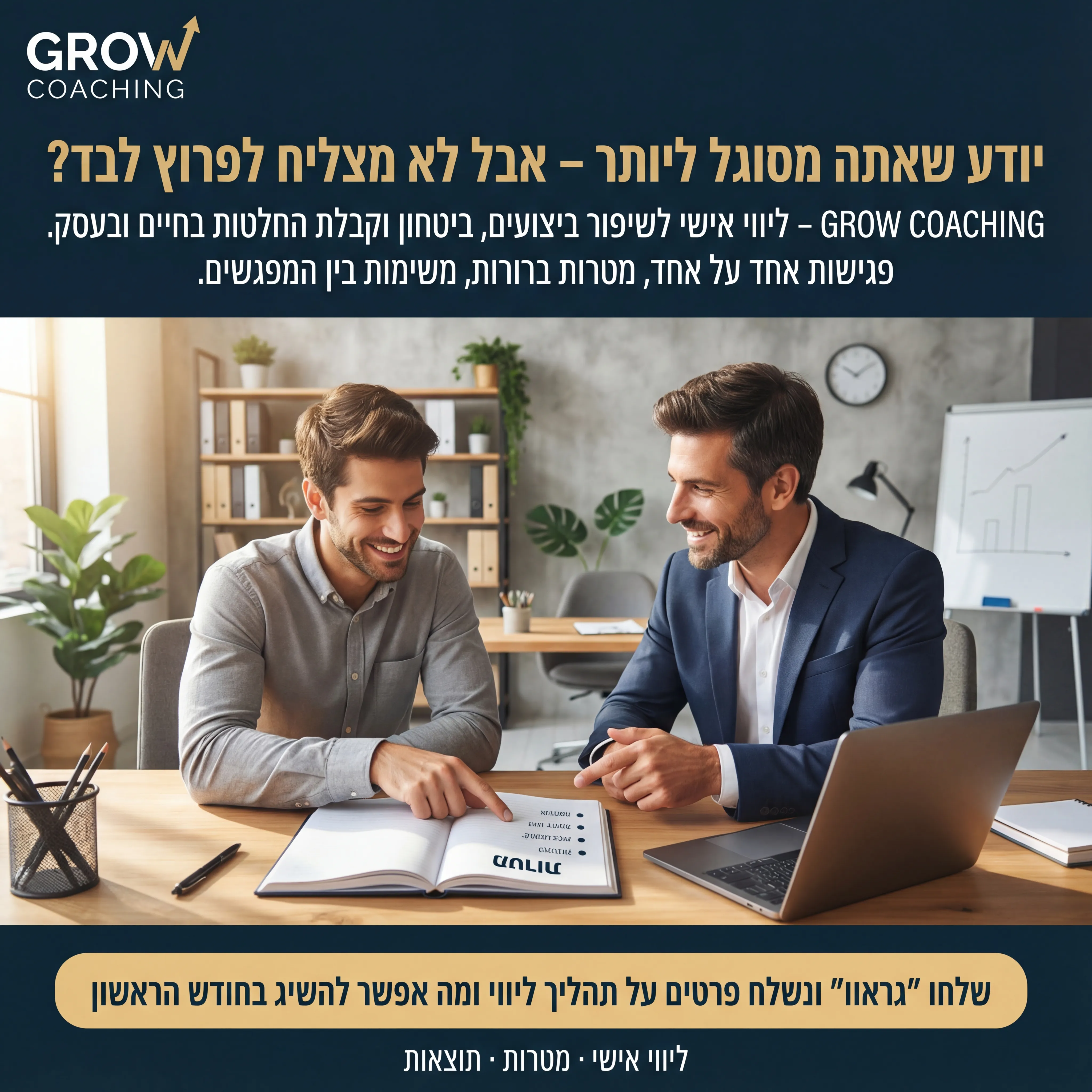 " 🚀 GROW COACHING 2 טקסט מודעה: כותרת: יודע שאתה מסוגל ליותר – אבל לא מצליח לפרוץ לבד? שורה שנייה: GROW COACHING – ליווי אישי לשיפור ביצועים, ביטחון וקבלת החלטות בחיים ובעסק. שורה שלישית: פגישות אחד על אחד, מטרות ברורות, משימות בין המפגשים. CTA: שלחו “גראוו” ונשלח פרטים על תהליך ליווי ומה אפשר להשיג בחודש הראשון. רעיון לתמונה: אדם יושב עם מאמן מול לפטופ/מחברת, מצביעים על דף עם מטרות. רקע משרד/חלל עבודה. לוגו GROW COACHING למעלה. טקסט קטן: “ליווי אישי · מטרות · תוצאות”. "