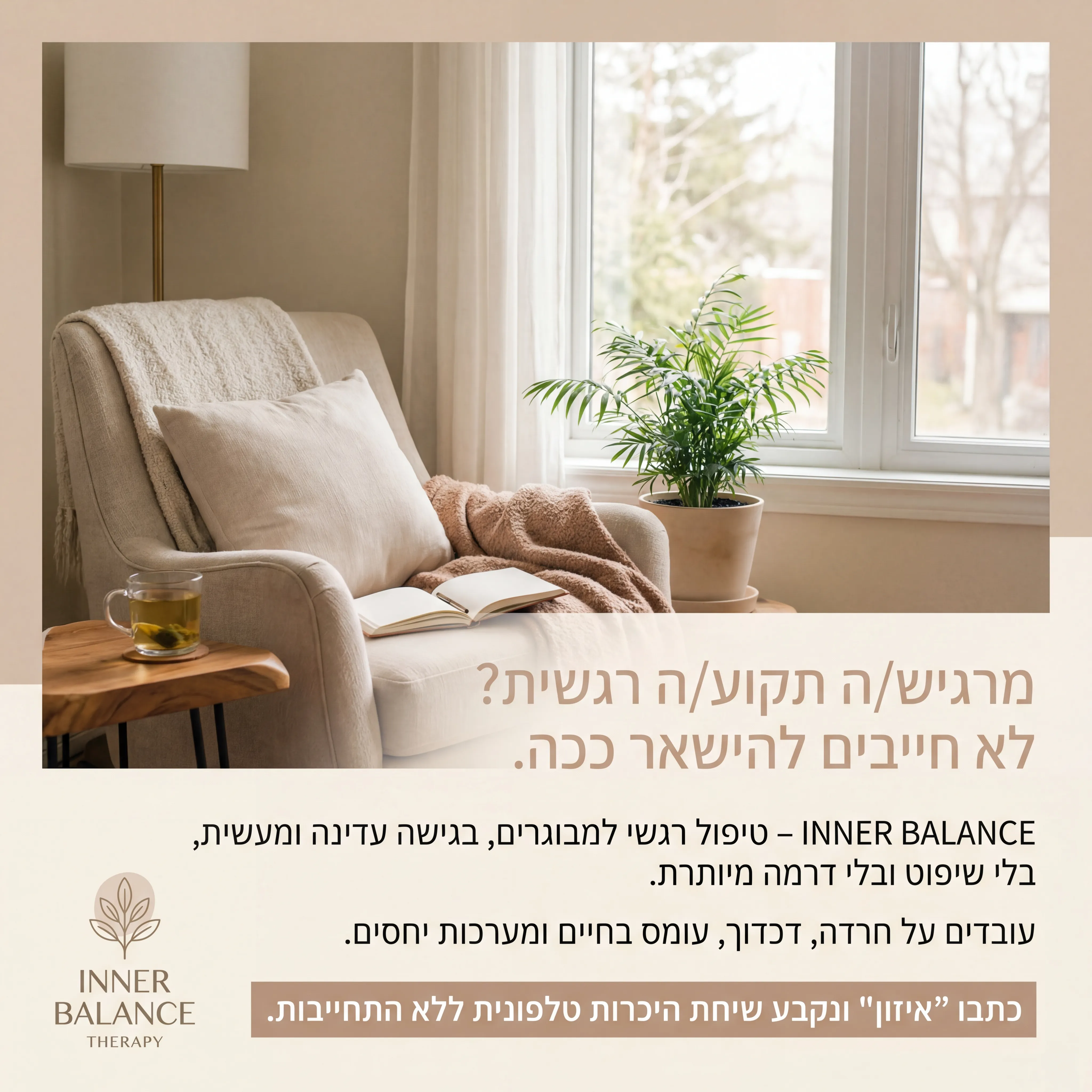 "🌿 INNER BALANCE THERAPY 1 טקסט מודעה: כותרת: מרגיש/ה תקוע/ה רגשית? לא חייבים להישאר ככה. שורה שנייה: INNER BALANCE – טיפול רגשי למבוגרים, בגישה עדינה ומעשית, בלי שיפוט ובלי דרמה מיותרת. שורה שלישית: עובדים על חרדה, דכדוך, עומס בחיים ומערכות יחסים. CTA: כתבו "איזון" ונקבע שיחת היכרות טלפונית ללא התחייבות. רעיון לתמונה: חדר טיפול חמים: כורסה, כוס תה, מחברת, אור טבעי מחלון. לוגו INNER BALANCE THERAPY בפינה. צבעים רכים (בז', ירקרק בהיר)."